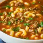 A comforting one-pot meal featuring savory ground beef, tender elbow macaroni, and a rich tomato broth.