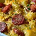 A comforting casserole featuring tender potatoes, savory kielbasa sausage, and a creamy, cheesy sauce.